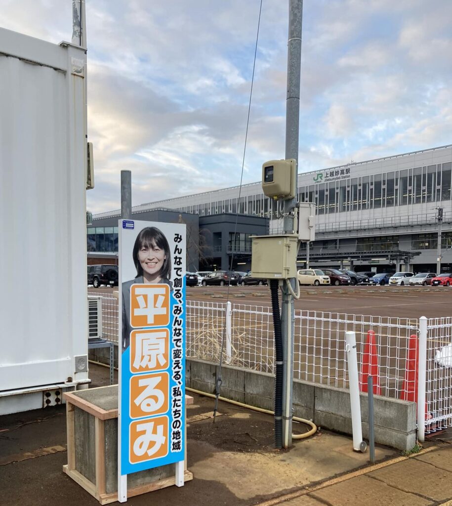 北陵新幹線上越妙高駅をバックに看板を立てました!新幹線が開業してもうすぐ丸9年ですね。